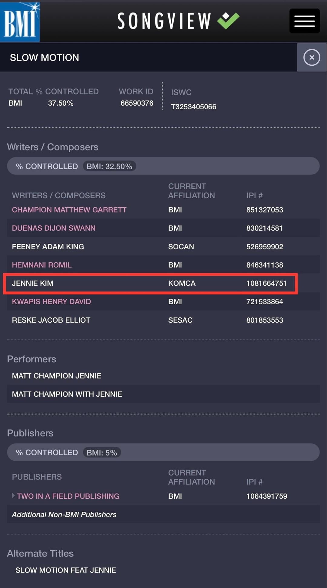 240715 Jennie (for ‘Slow Motion’ & ‘The Girls’) and Rosé (for ‘The Girls’) have been officially credited as writers/composers on BMI
