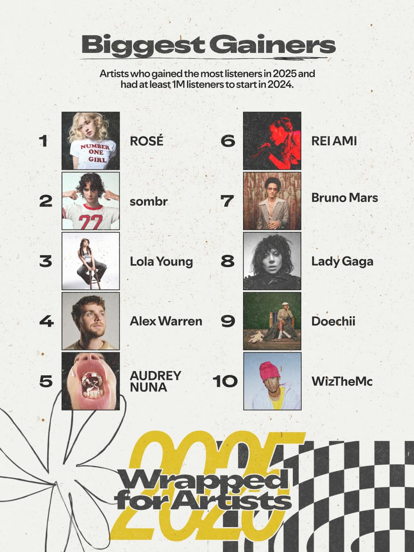 [@spotifyforartists](https://www.instagram.com/p/DR40fqeCfcJ/)>The listeners have spoken, and growth looks good on these artists whose meteoric rise took over 2025 📈