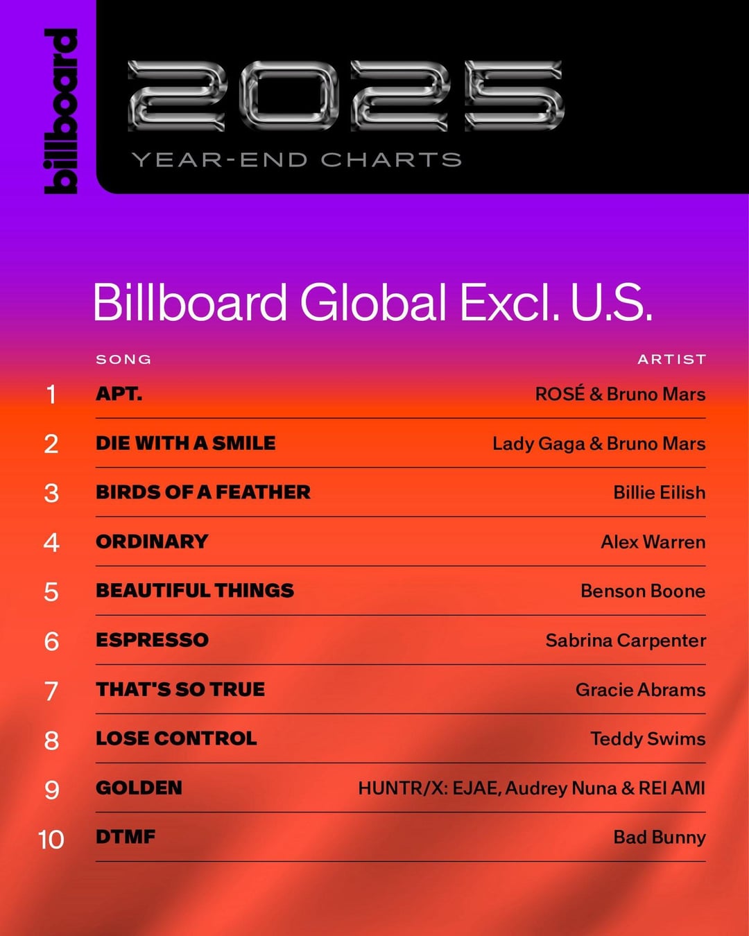 December 9, 2025 share251210 ROSÉ & Bruno Mars – ‘APT.’ ranks at #1 on both the Billboard Global 200 & Global Excl. US year-end charts!