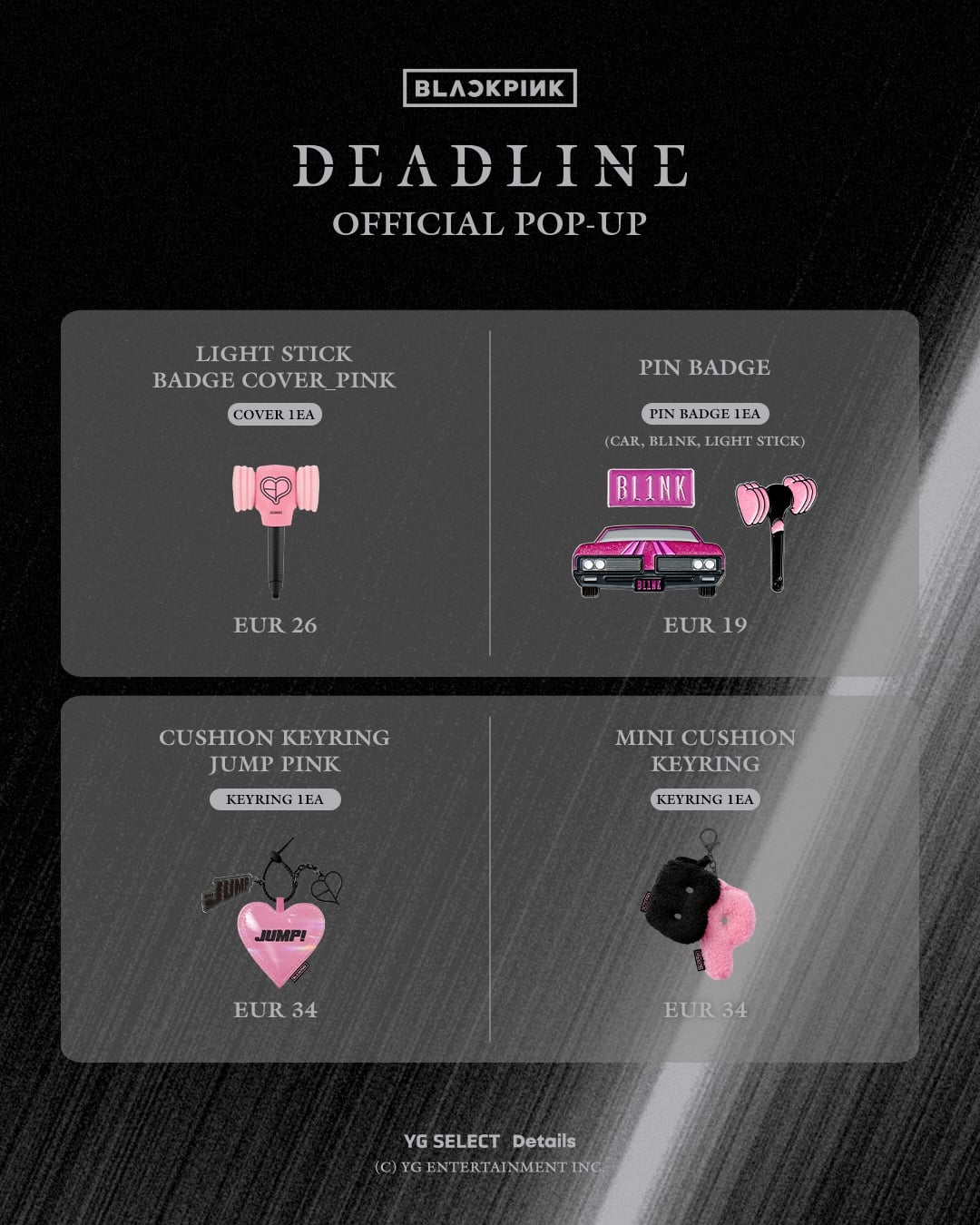 [ygselect](https://www.instagram.com/p/DWS35EdEl86/)> BLACKPINK [DEADLINE] OFFICIAL POP-UP IN BARCELONA IN MERCH LIST> 📅 26.03.27. (FRI) ~ 26.04.18. (SAT) ⏰ 09:00 – 21:00 (CET) 📍 ARENAS DE BARCELONA Level 0, Gran Via de les Corts Catalanes, 385, Eixample, 08015 Barcelona, SPAIN> #BLACKPINK #DEADLINE #3rdMINIALBUM #YG #YGSELECT