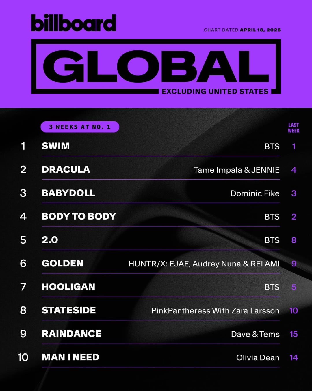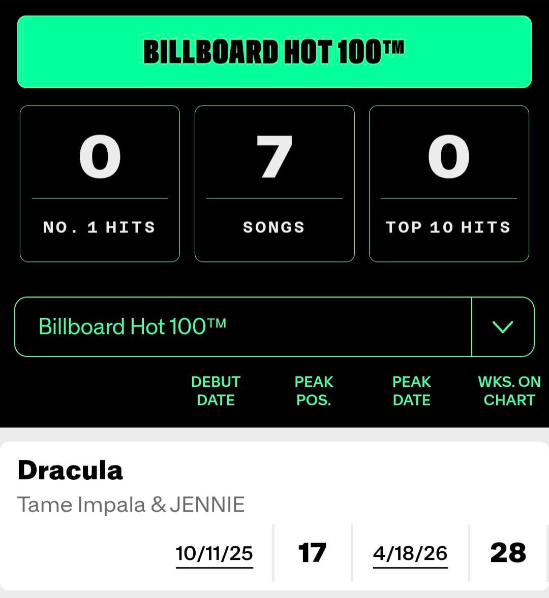 260414 Tame Impala & JENNIE – ‘Dracula’ reaches new peaks at #3 on the Billboard Global 200, #2 on the Billboard Global Excl. U.S. & #17 on the Billboard Hot 100!